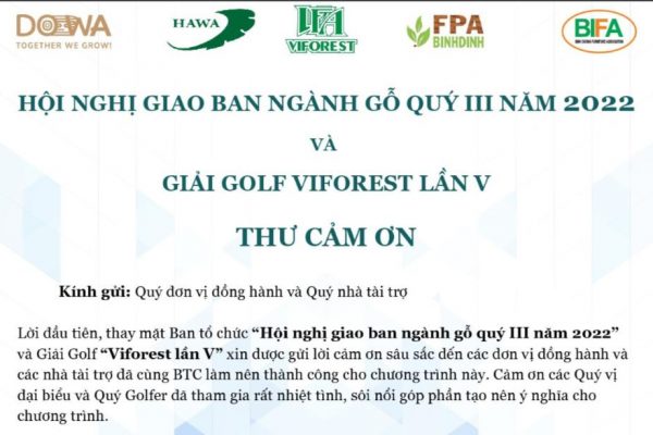 Thư cảm ơn “Hội nghị giao ban ngành gỗ quý III/2022” và “Giải GOLF VIFOREST lần V”Quản trị viên02/08/2022