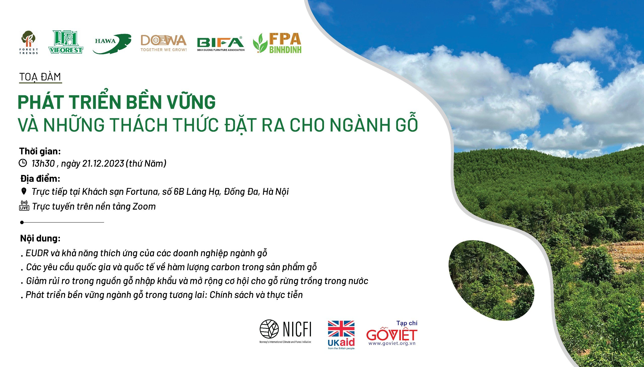 Hiệp hội gỗ và Lâm sản Việt Nam, các Hiệp hội Gỗ (HAWA, BIFA, DOWA, FPA Bình Định) và tổ chức Forest Trends phối hợp tổ chức Tọa đàm “Phát triển bền vững và những thách thức đặt ra cho ngành Gỗ” trân trọng kính mời Quý đại biểu tới tham dự sự kiện.