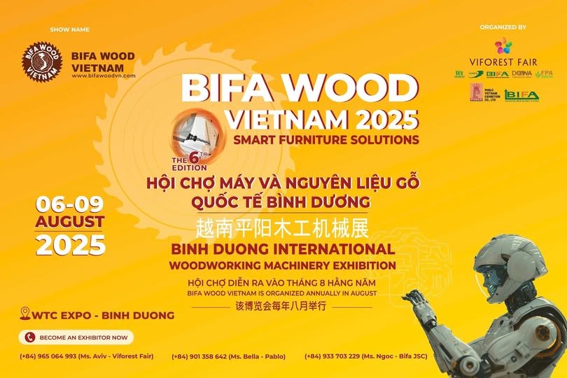 BIFA WOOD VIETNAM 2025 là hội chợ chuyên ngành lớn nhất và duy nhất tại Bình Dương nói riêng và khu vực nói chung tập trung vào lĩnh vực máy móc chế biến gỗ, gỗ nguyên liệu và các ngành công nghiệp phụ trợ. Đây là sự kiện quan trọng kết nối giao thương lý tưởng giữa các nhà sản xuất, nhà cung ứng, đại lý, đối tác trong và ngoài nước. Doanh nghiệp có thể: