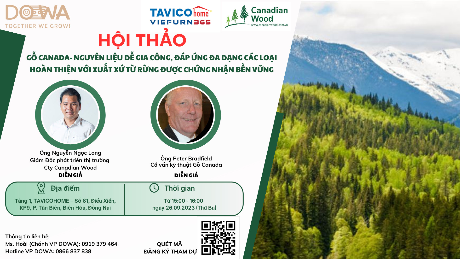 VP DOWA trân trọng kính mời Quý Doanh Nghiệp tham dự “Hội thảo Gỗ Canada – Nguyên Liệu Dễ Gia Công, Đáp Ứng Đa Dạng Các Loại Hoàn Thiện Với Xuất Xứ Từ Rừng Được Chứng Nhận Bền Vững” với thông tin cụ thể như sau: