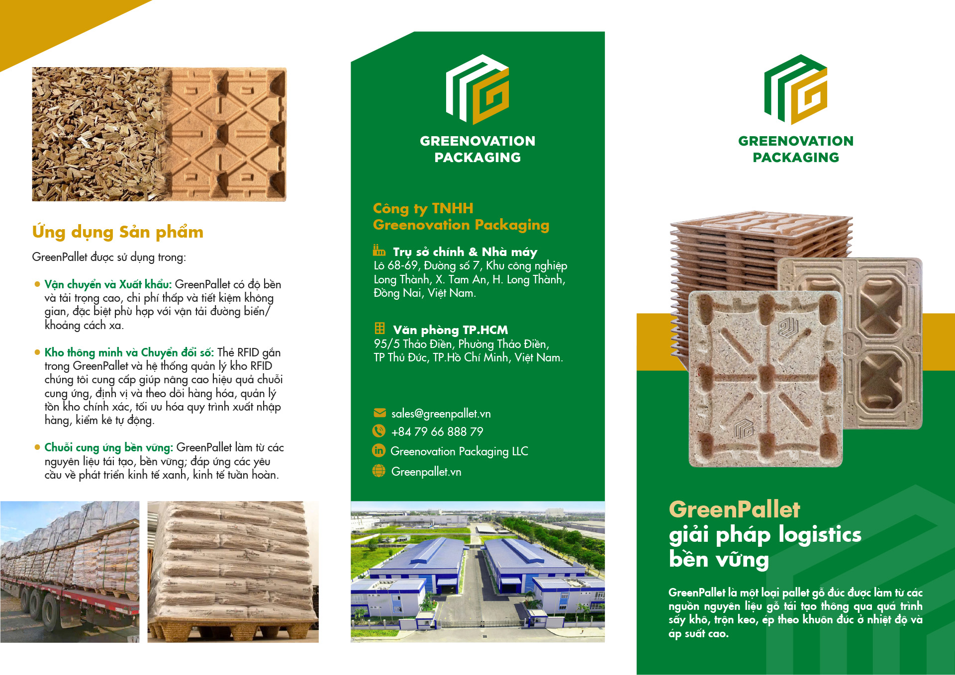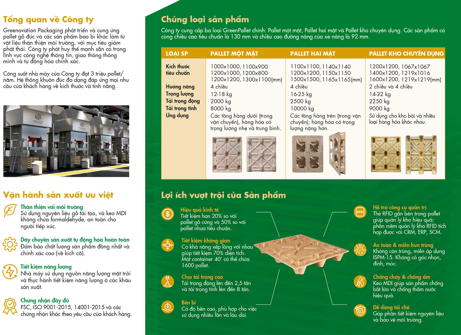 GreenPallet là một sản phẩm của Greenovation Packaging LLC. Chúng luôn quan tâm đến chất lượng sản phẩm và giảm phát thải, sử dụng keo thân thiện với môi trường giúp cho pallet có cấu trúc ổn định, khả năng chống thấm nước tốt, khả năng chịu tải mạnh. Hàm lượng formaldehyde thấp gần bằng 0, an toàn cho người sử dụng. Các sản phẩm đều được thiết kế với chiều cao tiêu chuẩn 130 mm và khoảng cách từ mặt đất 92 mm, đảm bảo tính đồng nhất và tiện lợi trong vận hành. Công ty chúng tôi cung cấp ba dòng sản phẩm chính: