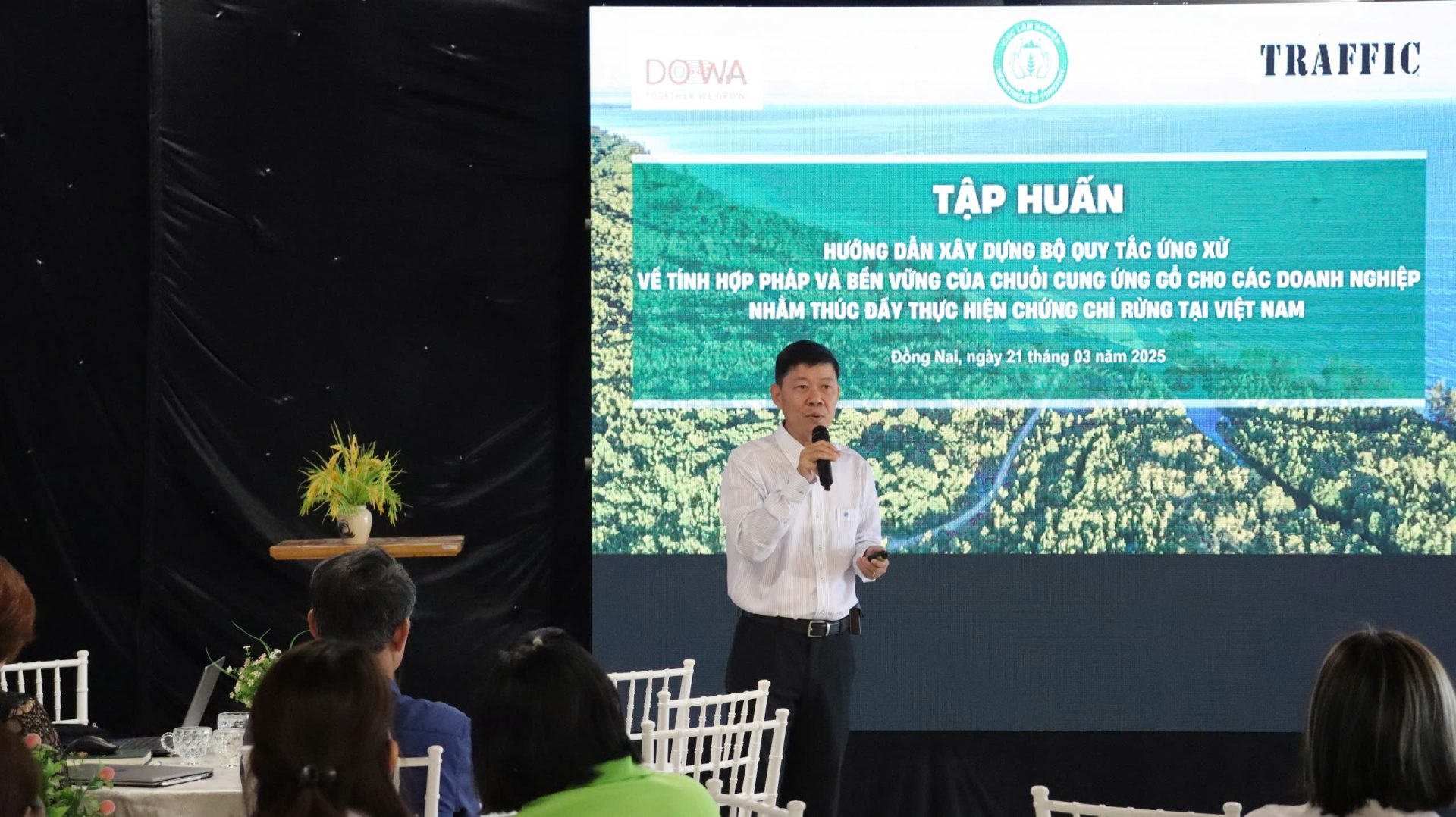 Sáng ngày 21.03.2025 tại Sảnh TACASA – Số 81, đường Điểu Xiển, KP9, P.Tân Biên, Biên Hòa, Đồng Nai. Cục Lâm nghiệp và Kiểm lâm, Tổ chức TRAFFIC đã phối hợp với Hiệp hội Gỗ và Thủ công mỹ nghệ Đồng Nai (DOWA) tổ chức lớp tập huấn “Hướng dẫn xây dựng Bộ Quy tắc ứng xử về tính hợp pháp và bền vững của chuỗi cung ứng gỗ cho các doanh nghiệp thúc đấy thực hiện chứng chỉ rừng tại Việt Nam”. Nội dung buổi tập huấn nói về Bộ quy tắc ứng xử cần đảm bảo các nguyên tắc quan trọng như tính hợp pháp, tính minh bạch, tính bền vững vàtrách nhiệm xã hội cũng như các bước xây dựng bộ Quy tắc ứng xử, xây dựng tiêu chuẩn và quy trình, đào tạo và triển khai. Ngoài ra lớp tập huấn cũng thảo luận về chuyển đổi số trong ngành Gỗ hiện nay.
