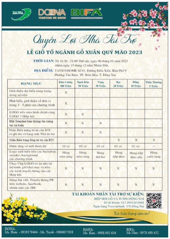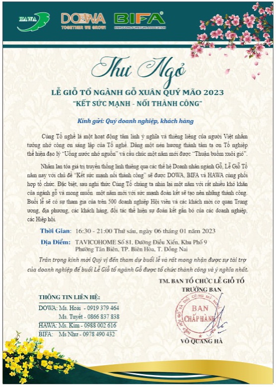Trân trọng kính mời Quý vị đến tham dự buổi lễ và rất mong nhận được sự tài trợ của doanh nghiệp để buổi Lễ Gỗ Tổ ngành Gỗ được tổ chức thành công và ý nghĩa nhất.