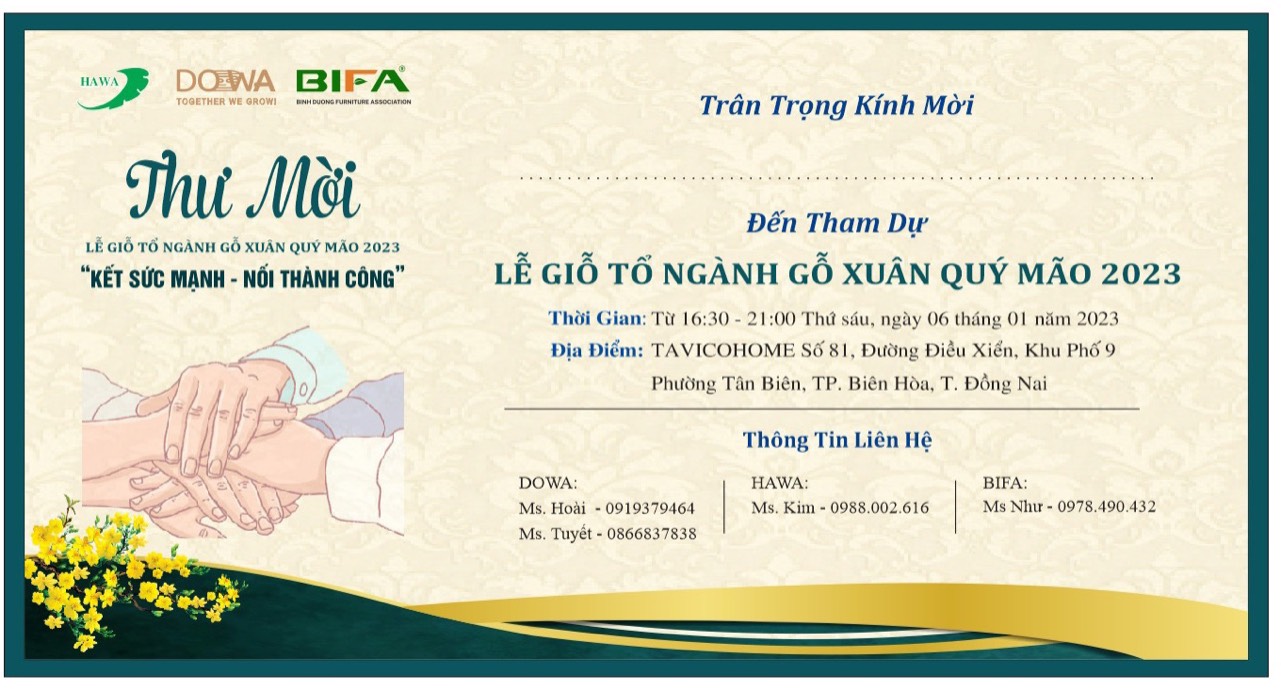 Nhằm lan tỏa truyền thống linh thiêng qua các thế hệ Doanh nhân ngành Gỗ, lễ giỗ Tổ năm nay với chủ đề “Kết sức mạnh – Nối thành công” sẽ được DOWA, BIFA & HAWA cùng phối hợp tổ chức. Đặc biệt, sau nghi thức Cúng Tổ chúng ta sẽ cùng nhìn lại một năm với rất nhiều khó khăn của ngành gỗ và mon muốn một năm mới với sức mạnh đoàn kết sẽ tạo nên những thành công. Buổi lễ sẽ có sự tham gia của trên 500 doanh nghiệp Hội viên và các khách mời cơ quan Trung ương, địa phương, các khách hàng đối tác thể hiện sự đoàn kết của các doanh nghiệp, các Hiệp hội.