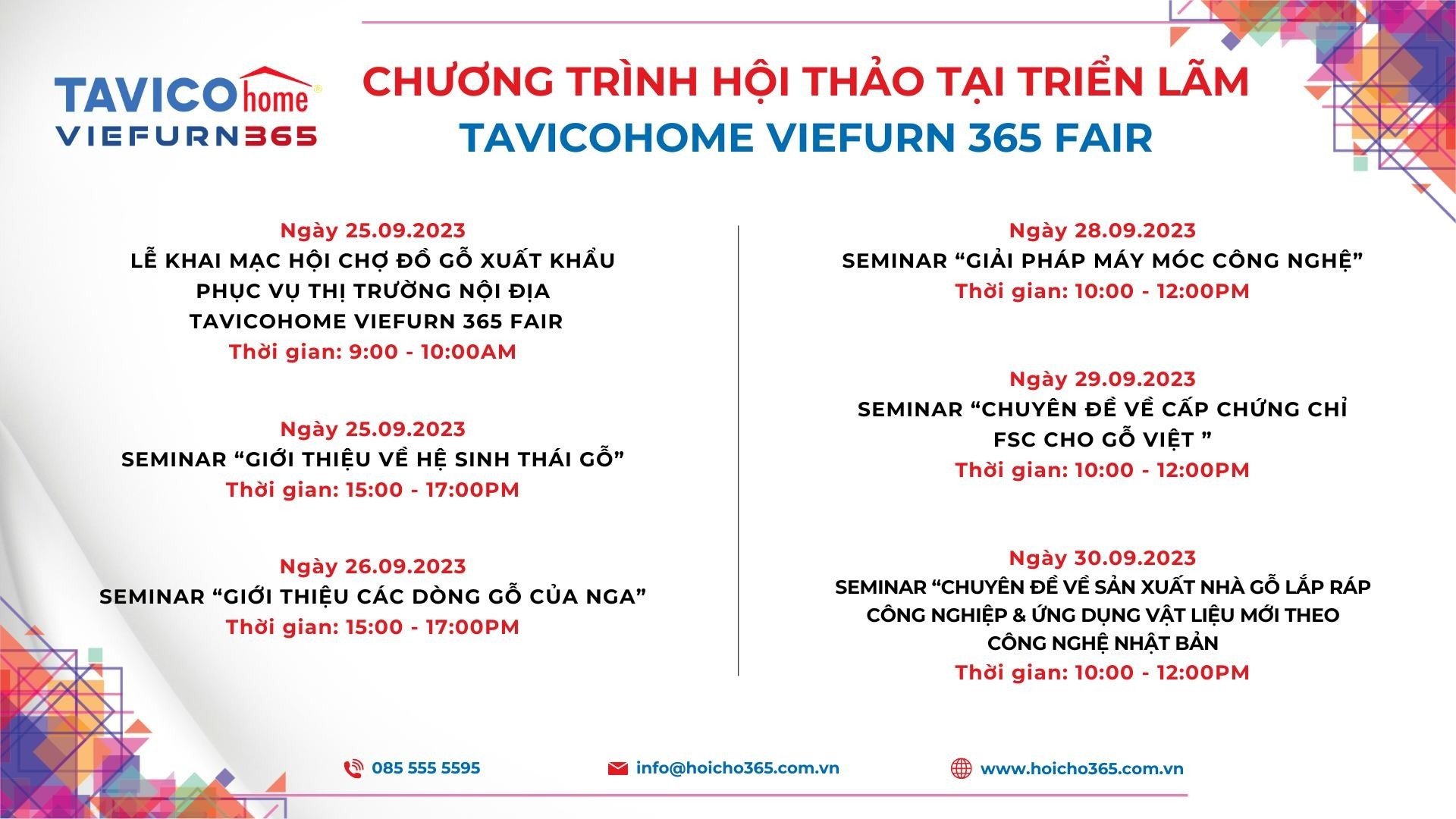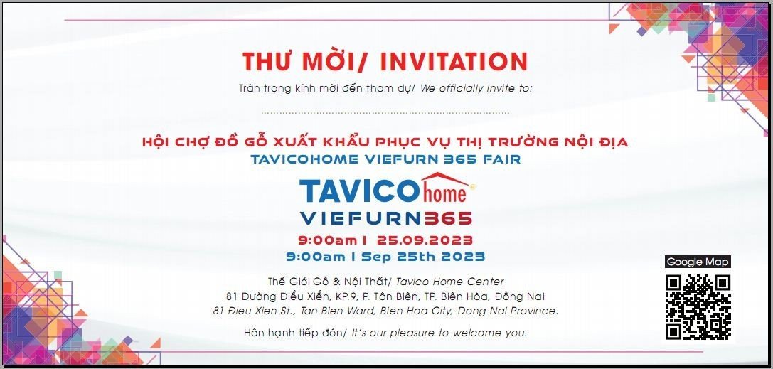 Hội chợ đồ gỗ xuất khẩu phục vụ thị trường nội địa Tavicohome Viefurn 365 Fair sẽ diễn ra từ ngày 25/09/2023 đến ngày 01/10/2023 tại Tavico Home, 81 Điểu Xiển, phường Tân Biên, Thành phố Biên Hòa, Đồng Nai.