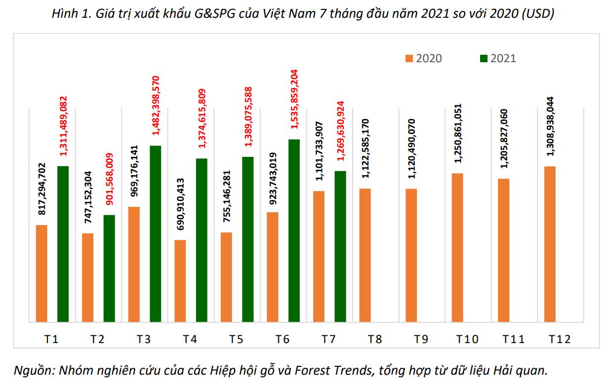 Tính toán của Nhóm nghiên cứu của các Hiệp hội gỗ và Tổ chức Forest Trends từ nguồn dữ liệu xuất khẩu gỗ của Tổng cục Hải quan cho thấy kim ngạch xuất khẩu các mặt hàng gỗ của Việt Nam trong 7 tháng đầu 2021 đạt 9,26 tỷ USD, tăng 54% so với cùng kỳ năm 2020. Tuy nhiên, biện pháp giãn cách xã hội làm co hẹp các hoạt động sản xuất kinh doanh của các doanh nghiệp trong ngành, với kim ngạch xuất khẩu của Tháng 7 năm 2021 đạt gần 1,3 tỷ USD, giảm 17,3% so với kim ngạch xuất khẩu của Tháng 6 cùng năm. Con số công bố gần đây của Tổng cục Hải Quan cho thấy kim ngạch xuất khẩu trong 15 ngày đầu Tháng 8 chỉ đạt 373,8 triệu, tương đương 45,5% so với kim ngạch 15 ngày đầu Tháng 7 năm 2021. Với tình hình giãn cách xã hội đang diễn ra như hiện nay, các hoạt động sản xuất kinh doanh của doanh nghiệp sẽ tiếp tục bị ảnh hưởng. Dự kiến kim nghạch xuất khẩu nửa cuối tháng 8 và thời gian sau đó – cho tới dịch bệnh được kiểm soát – sẽ còn tiếp tục giảm sâu. Hình 1 chỉ ra sự sụt giảm về giá trị xuất khẩu gỗ và sản phẩm gỗ của Việt Nam trong 7 tháng đầu năm 2021 so với các tháng của năm 2020.