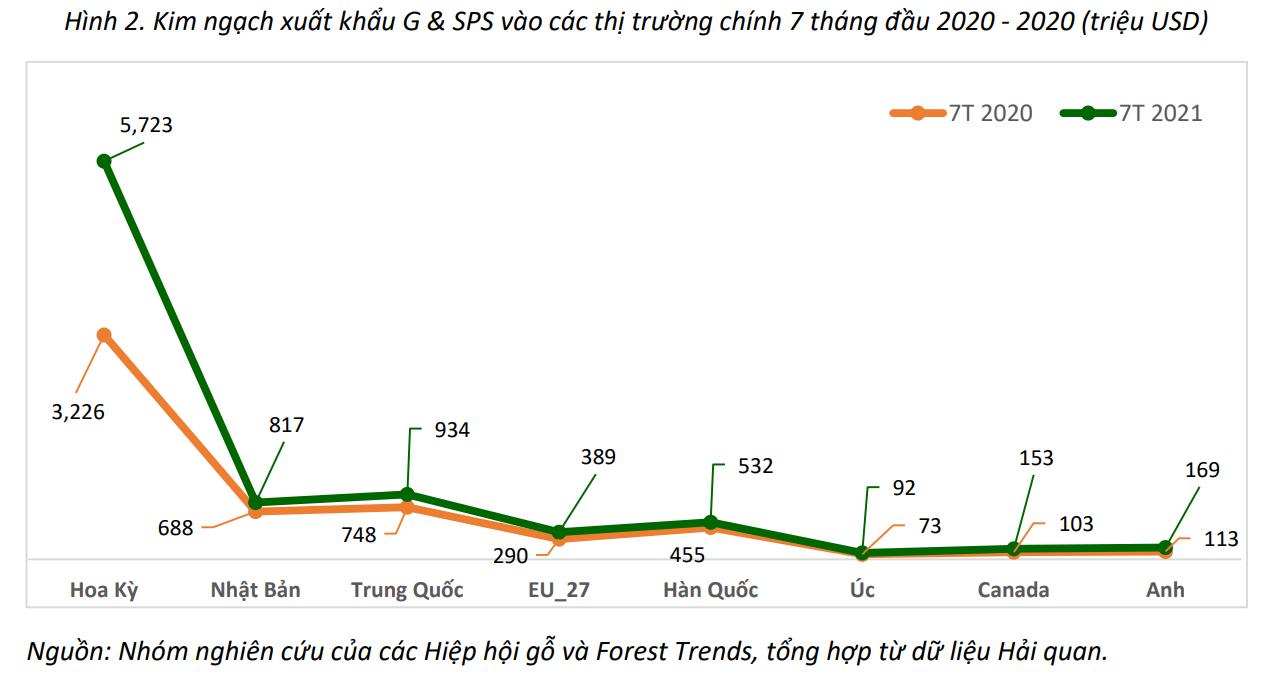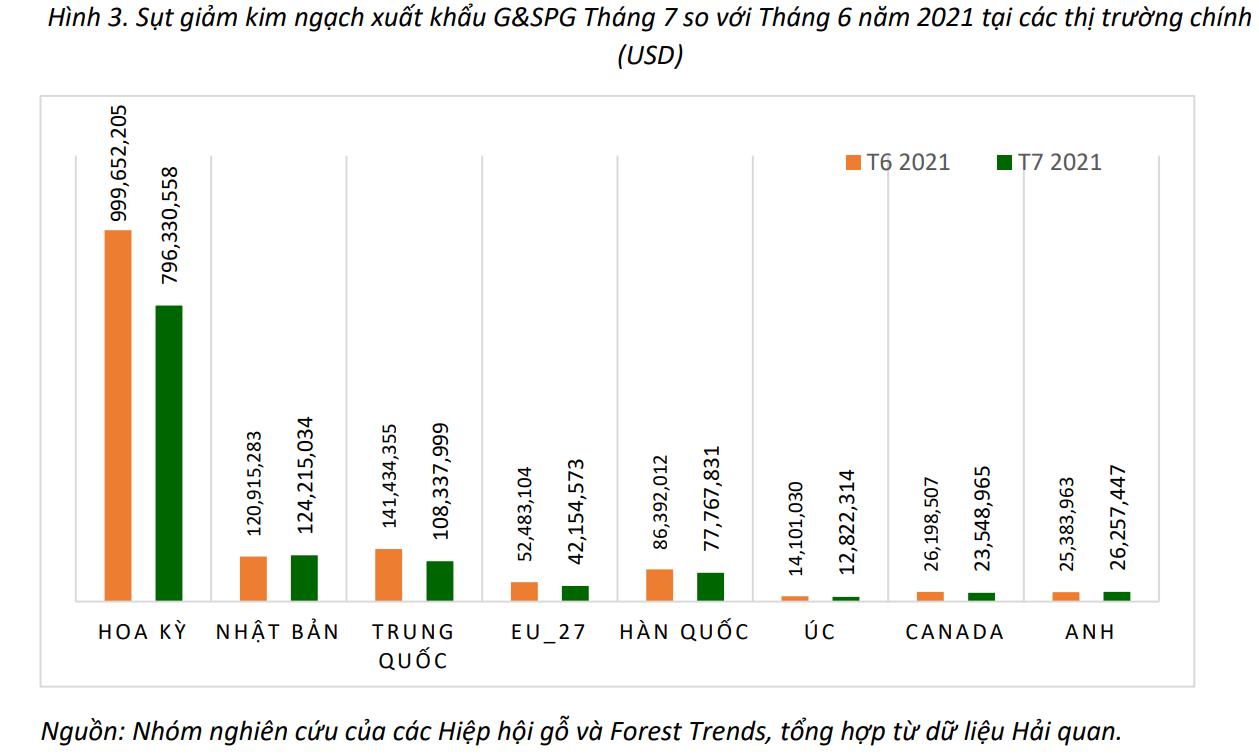 Tuy nhiên, trong Tháng 7 năm 2021 trừ mặt hàng ván dăm và ván sợi đạt tăng trưởng dương, tất cả các mặt hàng khác đều giảm so với Tháng 6 trước đó, cả về lượng và kim ngạch (Bảng 1). Một số mặt hàng có tốc độ giảm sâu về kim ngạch, như Ghế ngồi (kim ngạch Tháng 7 giảm 26% so với kim ngạch Tháng 6), Đồ gỗ (giảm 17%), Dăm gỗ (giảm 17%), Viên nén (giảm 14%)