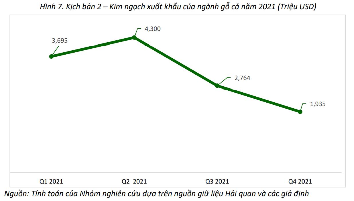 Kịch bản này dựa trên giả định rằng từ nay tới hết 2021 dịch bệnh vẫn chưa được kiểm soát hiệu quả. Đà suy giảm về kim ngạch xuất khẩu sẽ tiếp tục kéo dài cho tới hết Quý 4, với kim ngạch xuất khẩu của Quý 4 chỉ tương đương 70% kim ngạch xuất khẩu của Quý 3. Nói cách khác, giả định này cho rằng suy giảm kim ngạch xuất khẩu như hiện nay vẫn chưa chạm đáy mà sẽ còn tiếp tục giảm sâu ở các tháng cuối năm. Nếu giả định này xảy ra, kim ngạch xuất khẩu của cả ngành năm 2021 sẽ đạt con số khoảng 12,69 tỷ USD (Hình 7).