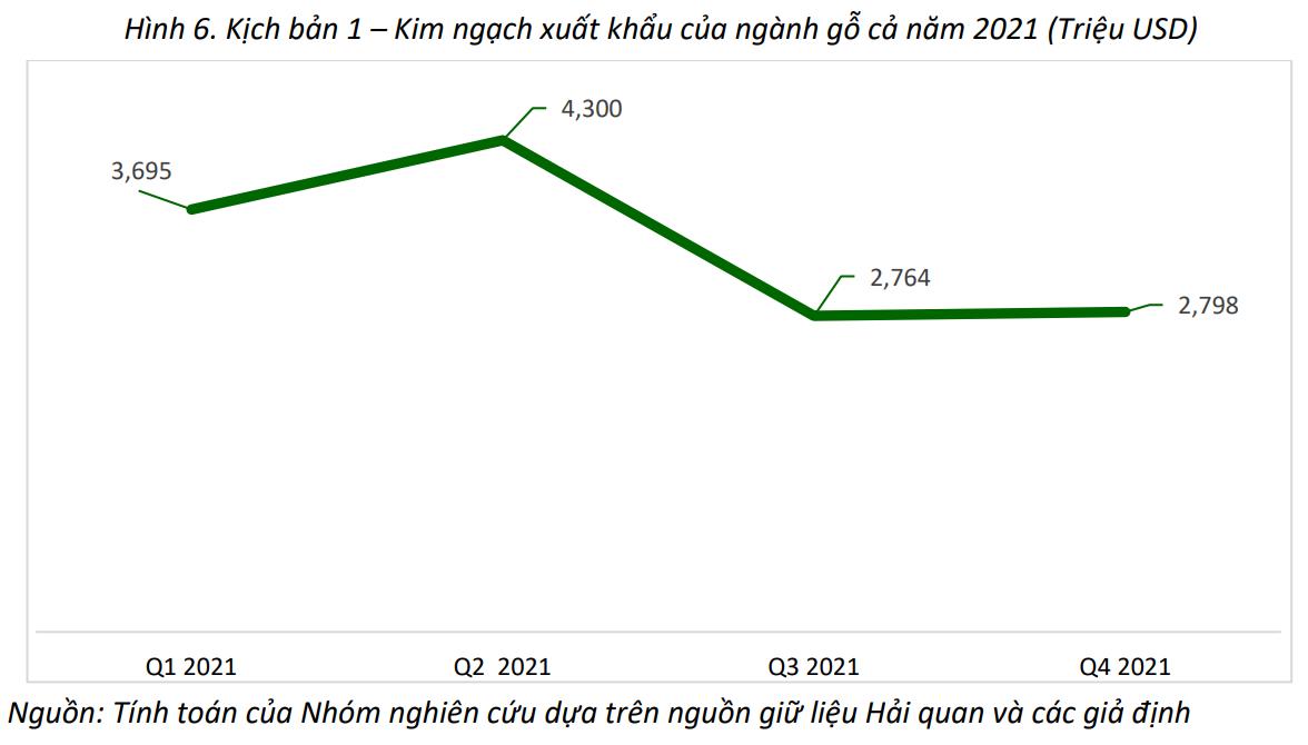 Giả định rằng kim ngạch xuất khẩu Quý 3 tiếp tục giảm như hiện nay. Như trên đã đề cập, kim ngạch xuất khẩu nửa đầu Tháng 8/2021 chỉ tương đương 45,5% kim ngạch xuất khẩu nửa đầu Tháng 7/2021. Giả định rằng mức suy giảm này tiếp tục được duy trì cho đến hết Quý 3; tuy nhiên, tình hình dịch bệnh sau đó được kiểm soát với sự phổ cập của vắc xin trong toàn quốc. Kim ngạch xuất khẩu trong Quý 4 sẽ bắt đầu hồi phục, nhưng mức hồi phục sẽ không thể tương đương với kim ngạch so với Quý 1 và Quý 2 trong cùng năm (trước thời điểm áp dụng giãn cách) mà chỉ đạt khoảng 70% so với kim ngạch trung bình của 2 quý này. Nếu các giả định này là đúng, tổng kim ngạch xuất khẩu của ngành năm 2021 sẽ đạt con số khoảng 13,55 tỷ USD (Hình 6).