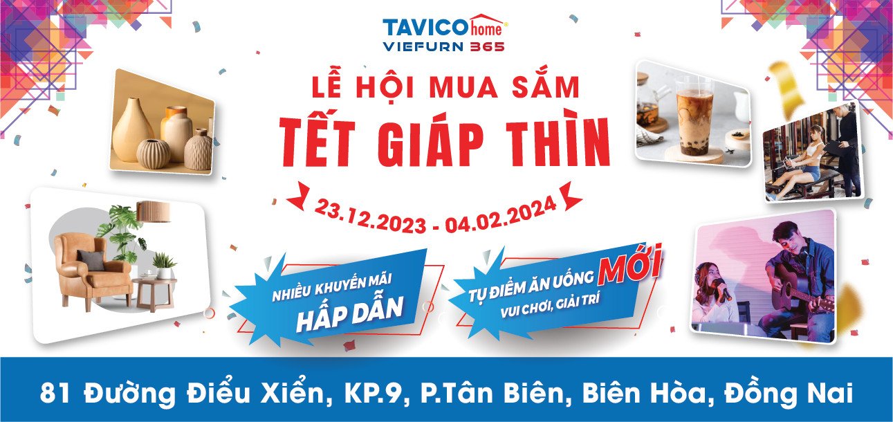Được sự chấp thuận của Sở Công thương Tỉnh Đồng Nai theo văn bản số 55/SCT-TM ngày 07/11/2023, đồng thời nhằm đáp ứng nhu cầu mua sắm của khách hàng trong địp Tết Nguyên đán Giáp Thìn 2024, TavicoHome tổ chức sự kiện “Lễ Hội Mua Sắm Tết Giáp Thìn” tại số 81 Điểu Xiển, P.Tân Biên, TP.Biên Hòa, Đồng Nai. Lễ hội được diễn ra từ ngày 23/12/2023 đến ngày 04/02/2024.