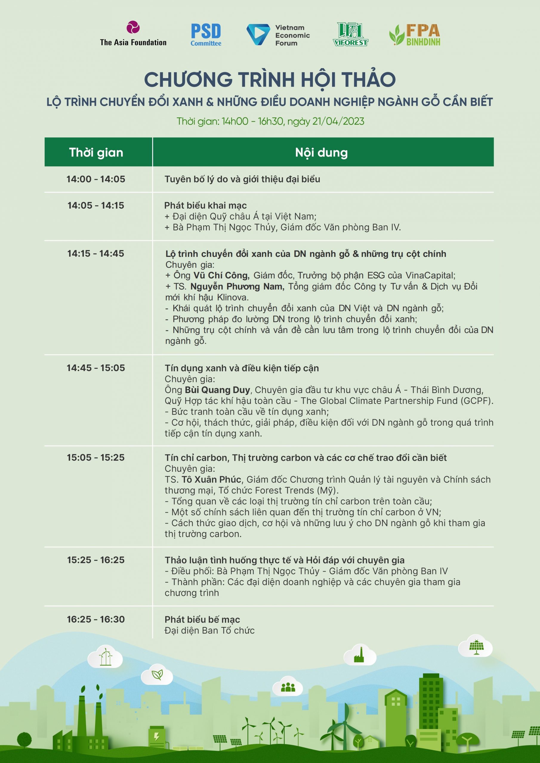 Hiệp hội Gỗ và Lâm sản Việt Nam, Hiệp hội Gỗ và Lâm sản Bình Định, Ban IV và Quỹ Châu Á phối hợp tổ chức Hội thảo “Lộ trình chuyển đổi xanh và những điều doanh nghiệp ngành gỗ cần biết” vào ngày 21/4/2023 tới. Ban tổ chức trân trọng kính mời Quý DN tham dự Hội thảo trên.