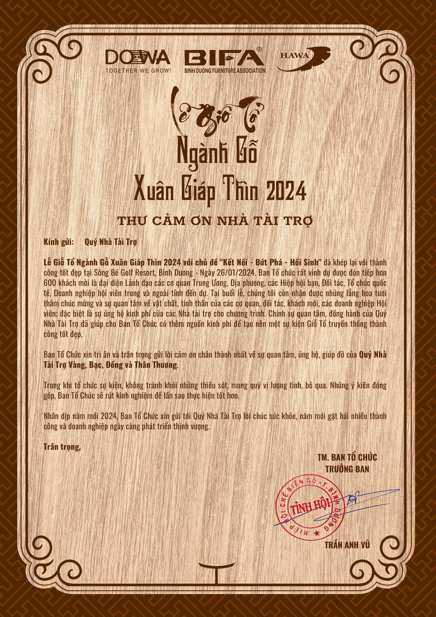 Thư cảm ơn “LỄ GIỖ TỔ NGÀNH GỖ XUÂN GIÁP THÌN 2024”