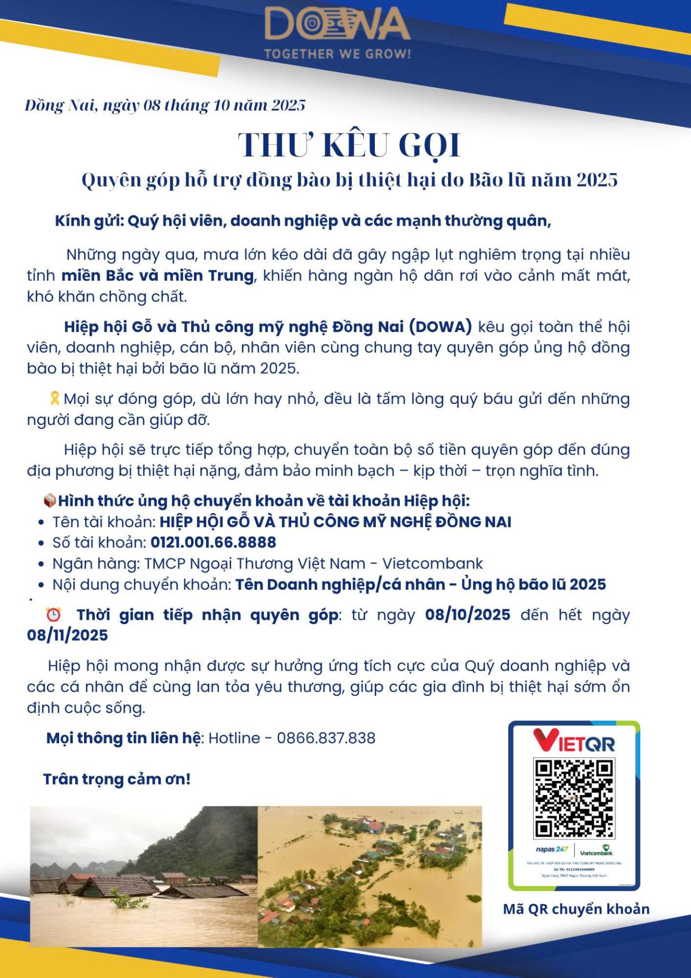 Hiệp hội Gỗ và Thủ công mỹ nghệ Đồng Nai (DOWA) kêu gọi toàn thể hội viên, doanh nghiệp, cán bộ, nhân viên cùng chung tay quyên góp ủng hộ đồng bào bị thiệt hại bởi bão lũ năm 2025.