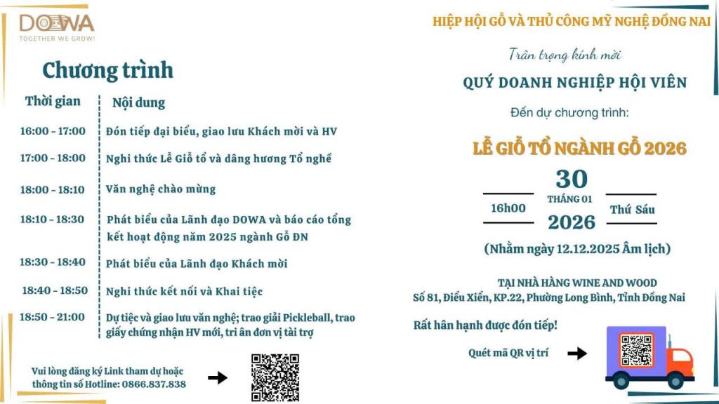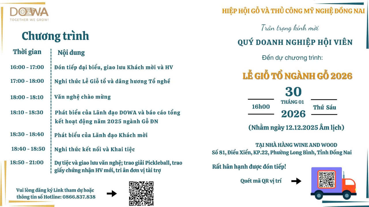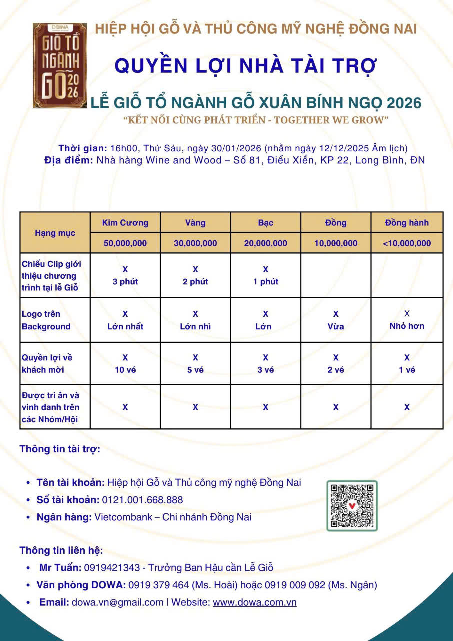 Tiếp tục gìn giữ truyền thống văn hóa tâm linh đầy ý nghĩa này, “Lễ giỗ tổ ngành Gỗ xuân Bính Ngọ 2026″ do hiệp hội Gỗ và Thủ Công Mỹ Nghệ Đồng Nai (DOWA) tổ chức. Với mục tiêu tìm về cội rễ, khơi lại những giá trị truyền thống từ các làng nghề lâu đời ở 3 miền Bắc – Trung – Nam, cùng hội tụ tinh hoa về dịp đại lễ Giỗ tổ này, để con cháu được bày tỏ lòng biết ơn, kính nghề, tạ nghiệp.