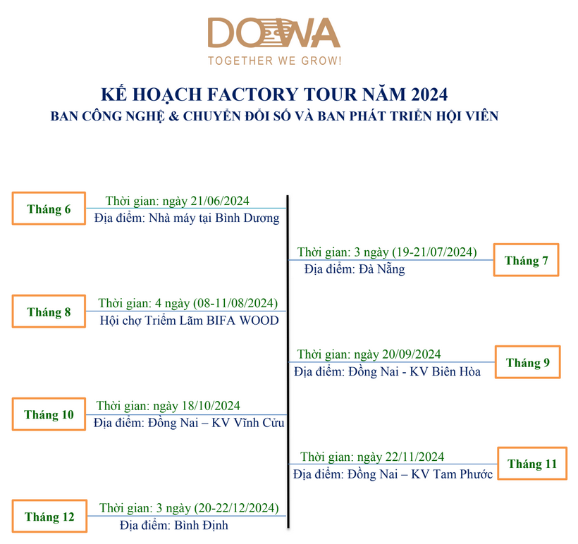 Nhằm mục đích kết nối và hỗ trợ Hội viên DOWA giao lưu, học hỏi, chia sẻ kinh nghiệm trong mô hình tổ chức, quản lý sản xuất và công nghệ của nhà máy chế biến gỗ. Hiệp Hội Gỗ và Thủ Công Mỹ Nghệ Đồng Nai (DOWA) tổ chức chương trình “FACTORY TOUR tháng 6 năm 2024”