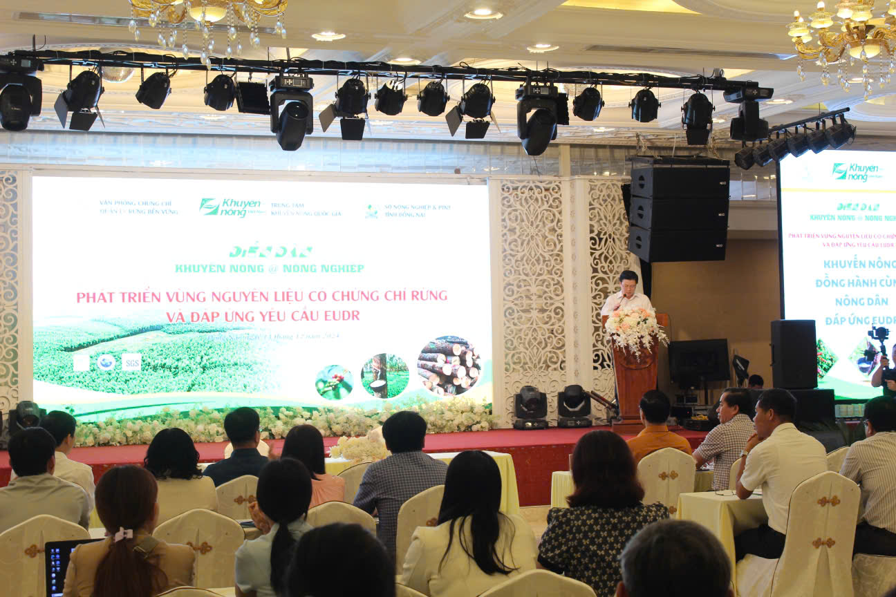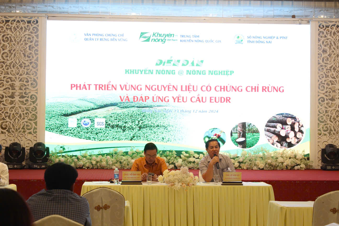 Sáng ngày 13/12/2024 tại Khách Sạn Đồng Nai; Trung tâm Khuyến nông Quốc gia, Sở NN&PTNT tỉnh Đồng Nai, Viện Khoa học Lâm nghiệp Việt Nam phối hợp với DOWA tổ chức Diễn đàn Phát triển vùng nguyên liệu có chứng chỉ rừng và đáp ứng yêu cầu Quy định của Châu Âu về sản xuất hàng hóa không gây mất rừng (EUDR) tham gia gồm có Lãnh đạo Trung tâm Khuyến nông Quốc gia, Lãnh đạo Sở NN&PTNT tỉnh Đồng Nai, Lãnh đạo Viện Khoa học Lâm nghiệp Việt Nam, đại diện Chi cục Kiểm lâm Đồng Nai và các Doanh nghiệp chế biến gỗ tham gia.